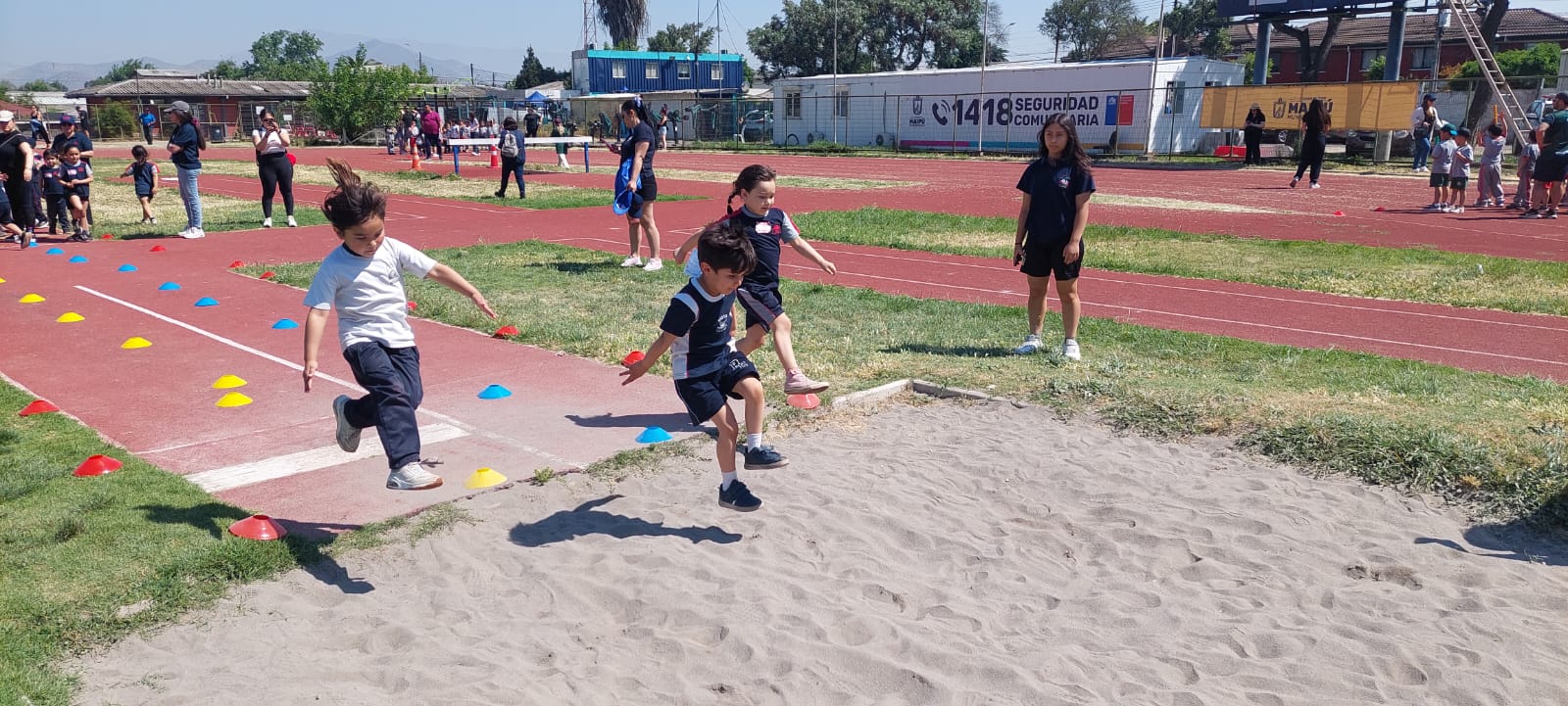 Durante la actividad, los niños y niñas disfrutaron de diversas pruebas atléticas como carreras de velocidad, obstáculos, lanzamiento de bala, salto largo, carrera con relevos y lanzamiento de jabalina.