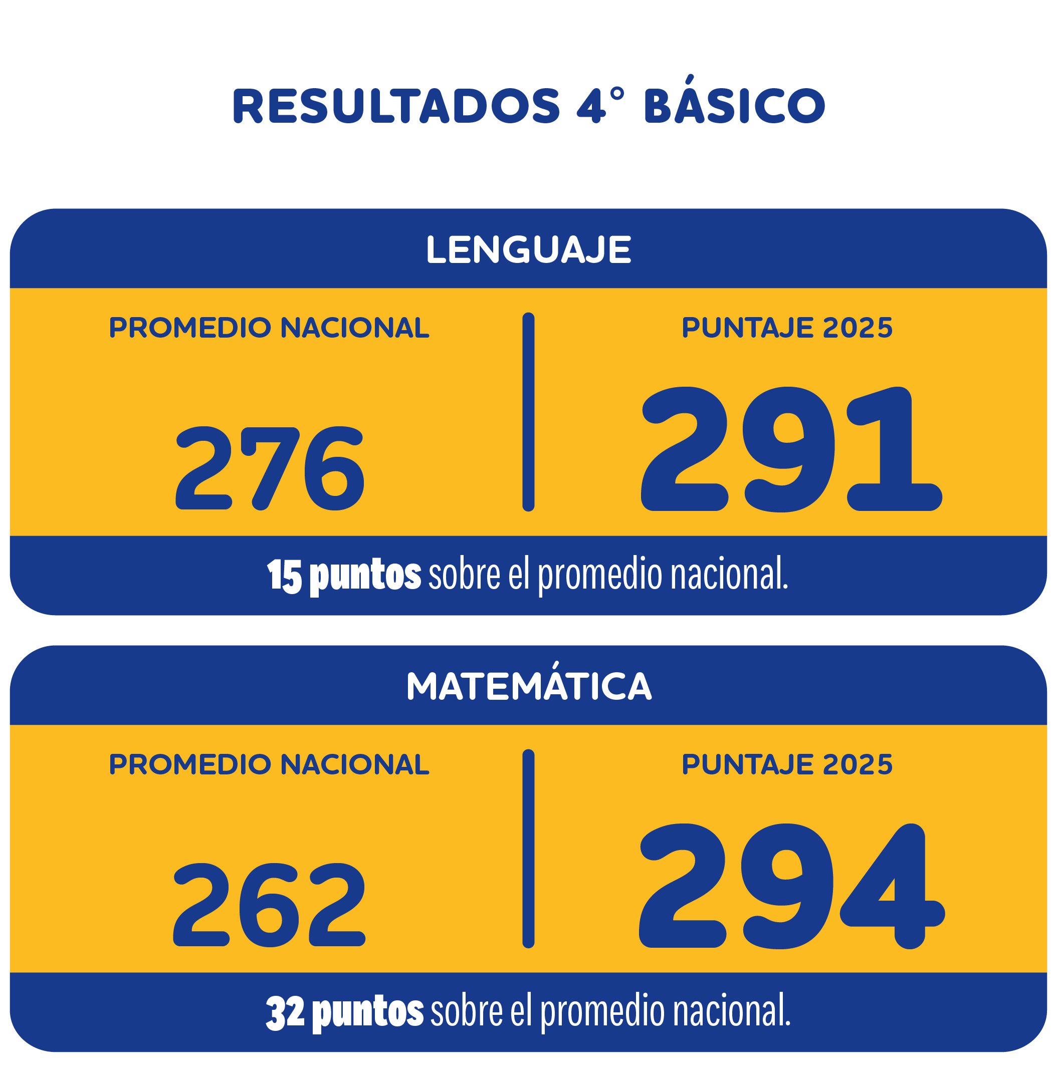 En 4º Básico, los puntajes en Lenguaje y Matemática superan el promedio nacional, con diferencias de 15 y 32 puntos respectivamente, dando cuenta de un nivel de logro sólido.
