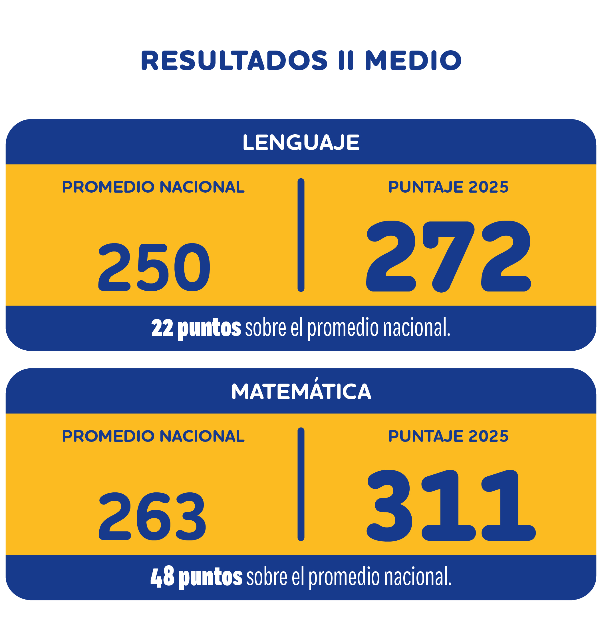 En II Medio, el desempeño mantiene esta tendencia, con resultados por sobre el promedio nacional en ambas asignaturas. En este nivel, destaca especialmente Matemática, con una diferencia de 48 puntos, junto con Lenguaje, que presenta una ventaja de 22 puntos.