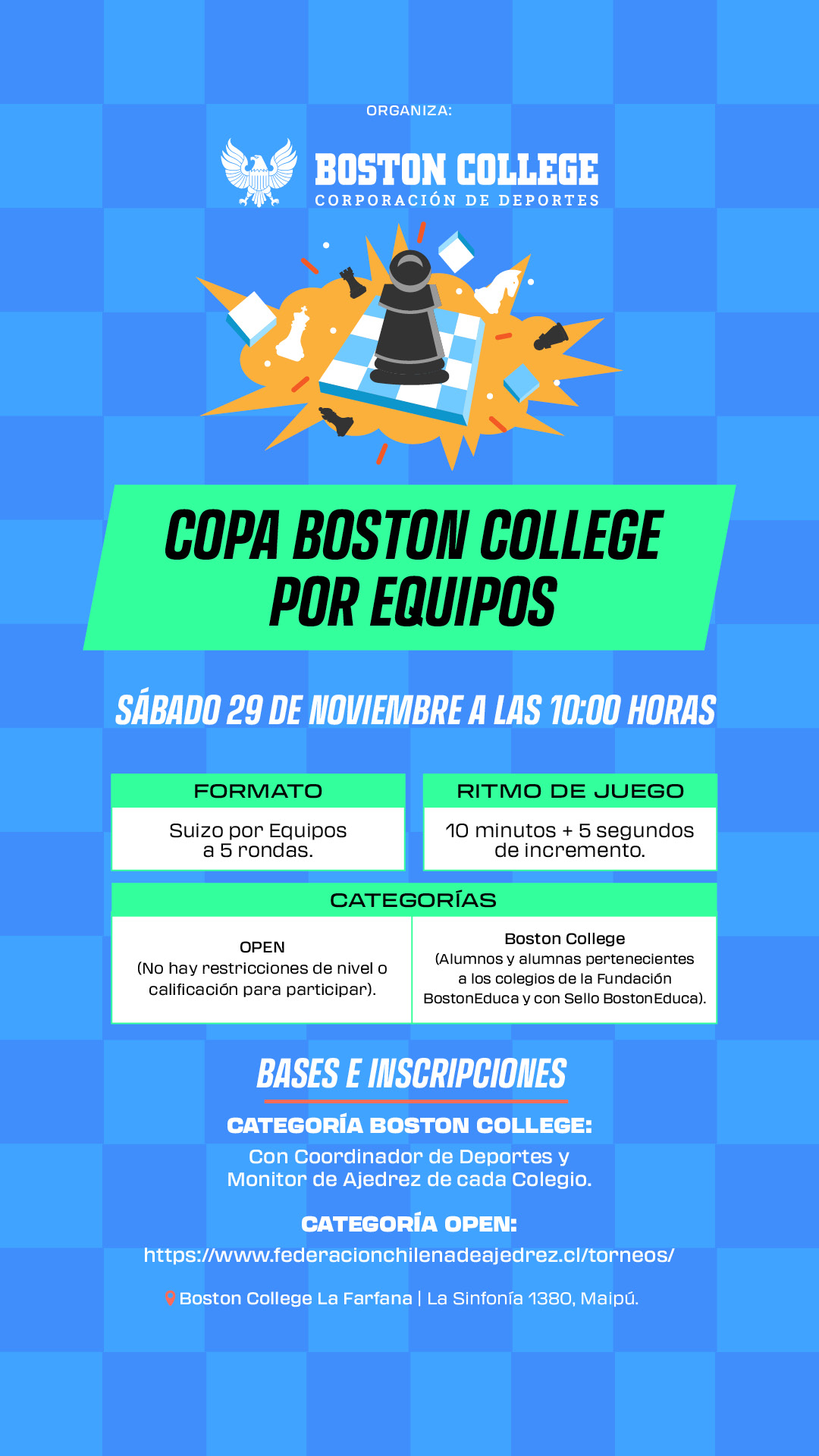 Extendemos una cordial invitación a toda nuestra comunidad escolar y a los ajedrecistas externos para ser parte de un nuevo desafío estratégico: la Copa Boston College por Equipos.